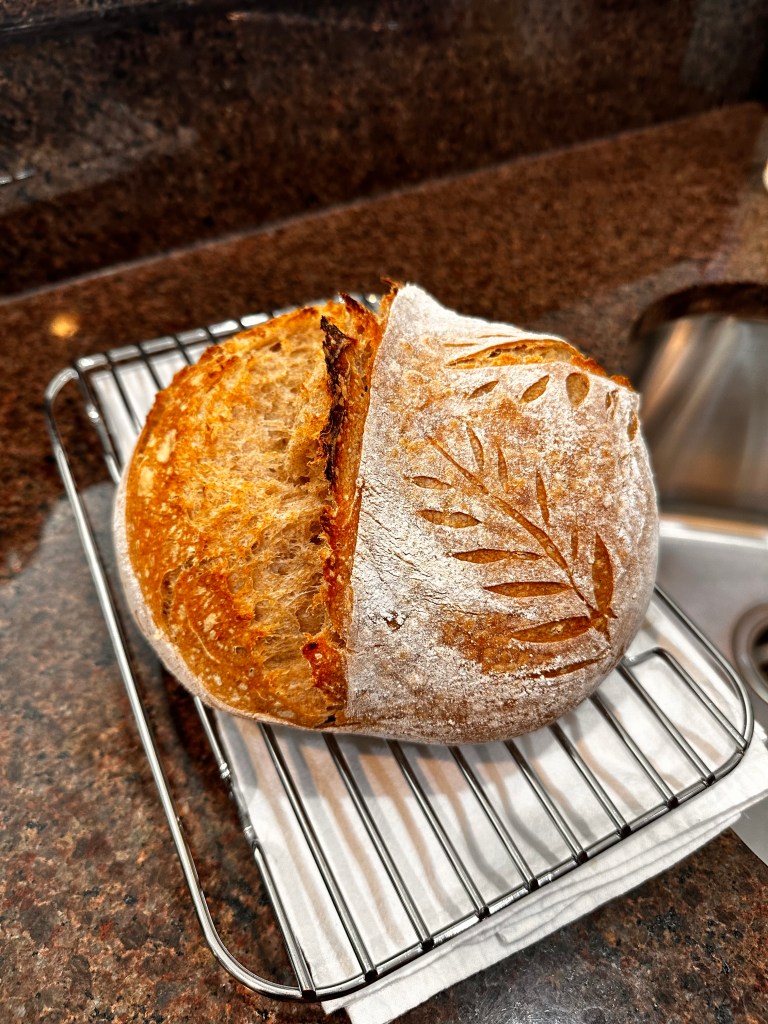 With this being just my third sourdough bake, I felt adventurous. I wanted to stray from the recipe I had been following, so what better…mix up the flour combo. Seventy-five percent King Arthur Bread Flour and twenty-five percent King Arthur Whole Wheat. And with that, I found a salt package from the Old Mill in Gatlinburg, TN containing Lemon, Rosemary and Garlic. The result: Outstanding! Over the course of the week I consumed the entire loaf. Even when it started to dry out, I just shifted to toast and it was really, really good!