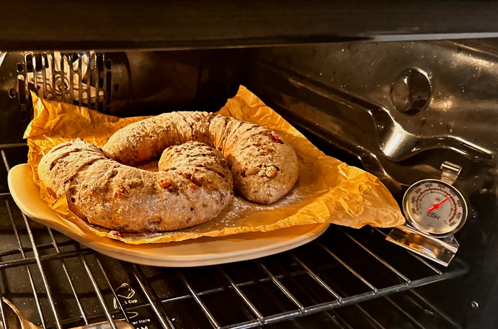 This was my first preferment bread, meaning it has both yeast and sourdough starter. Even with that it doesn’t rise very much due to the inclusions. I also had to mix a Preferment the night before which was nothing more than a very, very dry Leavin. Watching a few videos on the subject, this Preferment might be called a Bigga if baking in Italy. I say that because it was very dry. Even after resting all night it still looked like a mess the next morning.