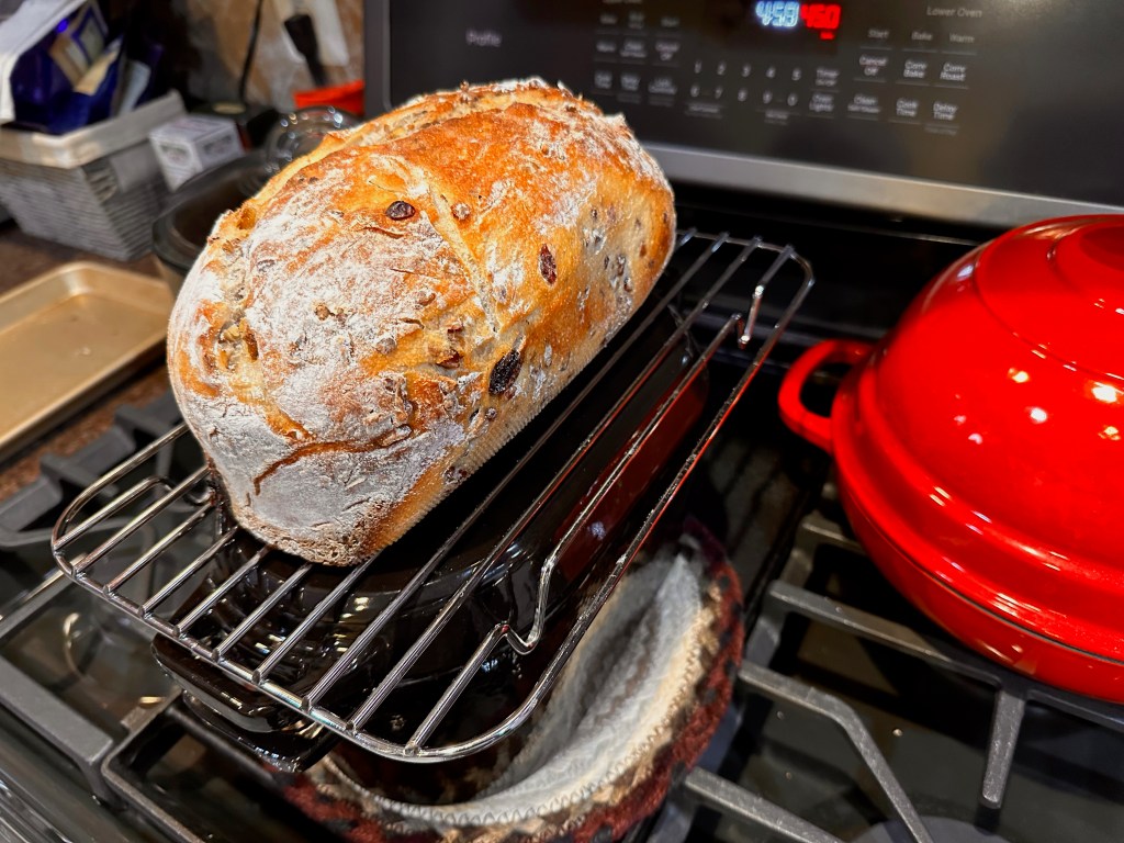 Typical. Autolyse for two hours…one hour just flour and water…the second hour with starter and salt added. Four stretch & folds with incorporation of the inclusions on the second stretch & fold. I think this might go astray of Elaine’s method as she might do hers during Lamination after Bulk Ferment, but don’t quote me. I’d have to look it up. Either way, adding inclusions during S&F worked just fine. My kitchen was approaching 80 degrees on this day so Bulk Ferment was about six hours. I followed with shaping and placement in a Banneton for Cold Proof until the next day. In this bake I timed everything perfectly it seems. The next morning the dough had risen a couple of inches above the Banneton. It seemed right on the edge of over-proofing, but not quite. The benefits of cooking in my “Kook” Bread Pot was similar to a loaf pan; everything was contained and the bread was baked evenly against the Pot.
