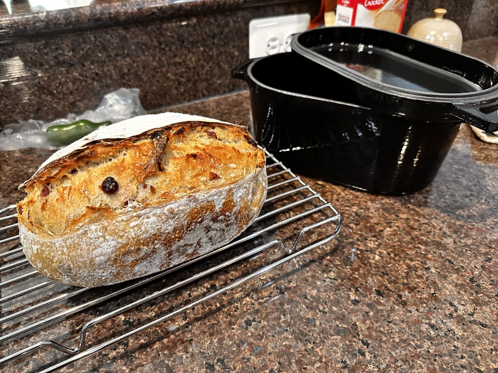 I settled on an Oat-Milk Cranberry recipe from Elaine Boddy’s book, the Sourdough Whisperer. I love cranberry and I knew that some would enjoy the health aspect of bread made with Oat Milk. I also improvised by adding some Sunflower Seeds, Golden Raisins and a few assorted crushed nuts. For the most part this recipe follows her standard Master Recipe with the exception of using Goat Milk instead of Water. I might have strayed by adding the inclusions during the 2nd Stretch & Fold. I believe the official recipe has you adding 75g of dried cranberries at the beginning when mixing everything else. I also added about 100g of nuts and seeds, which was not in the official recipe.
