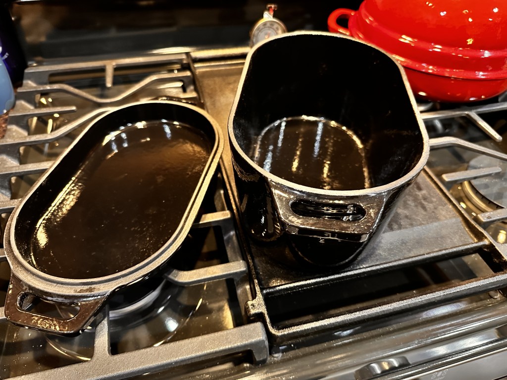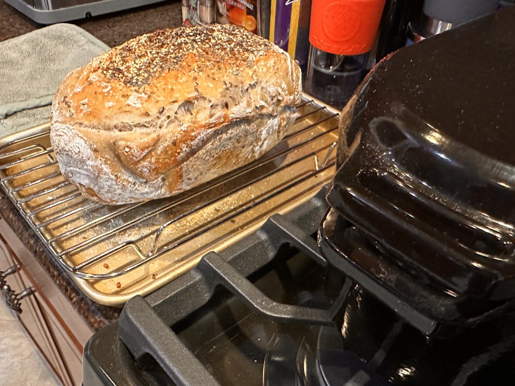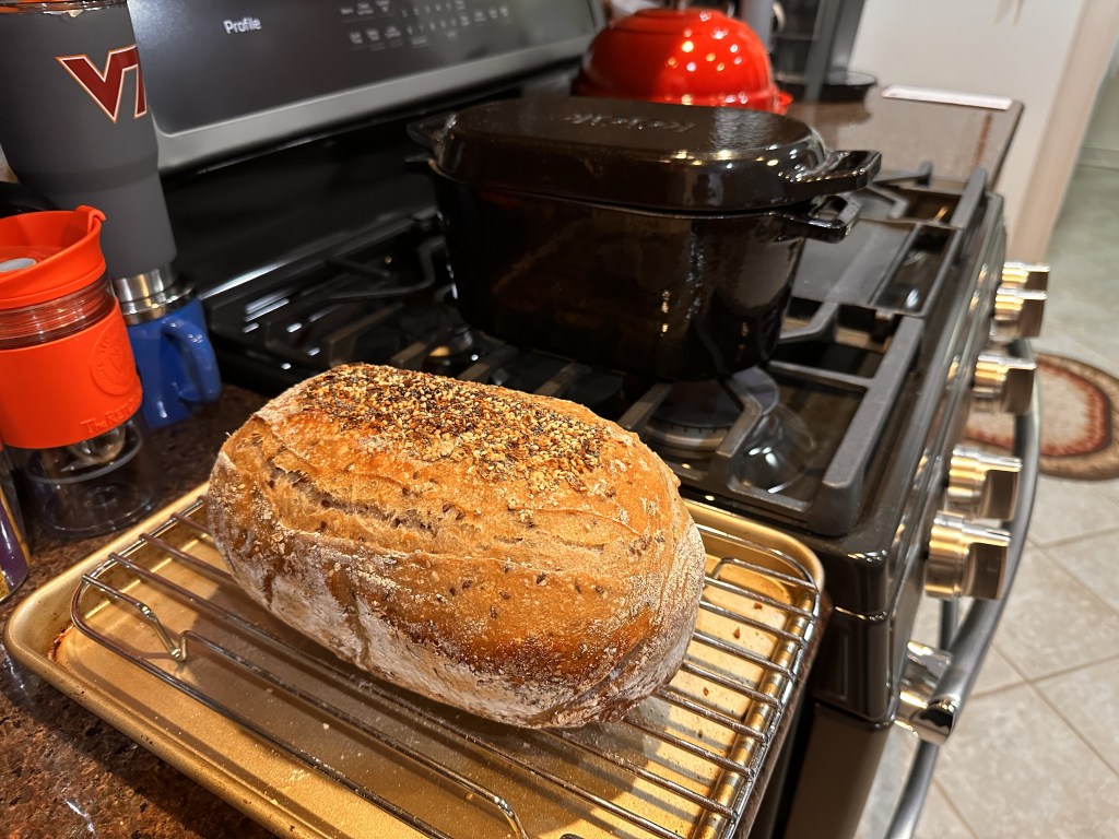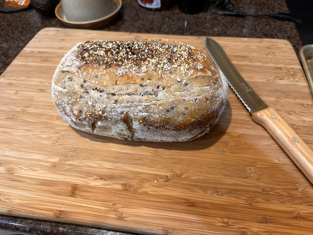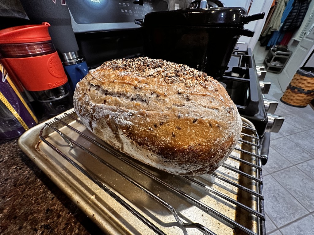I tried to incorporate an extra 50 grams of water. This was just to practice working with a more hydrated dough. I also wanted to open up the crumb. I also wanted some seed on top, so at the last minute I filed the bottom of the Banneton with “Everything but Bagel” spice. I have yet to slice it open so I’ll report back when I do. After two stays in the refrigerator over two days, I have overproofed the dough to some extent. When I turned the dough out for scoring it deflated and spread out. That’s the nice thing about the Kook baking pan….it’s somewhat narrow and holds things together.