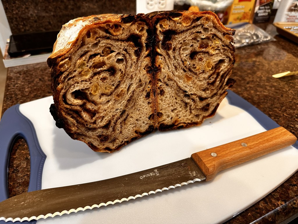 Prior to embarking on my Sourdough Journey, my go-to breat purchase at the grocery store was Cinnamon-Raisin, anything…bread, English Muffins, Bagels, etc. Considering my all-time most-liked bake is Cinnamon-Rolls, I decided to honor my Step-Son’s request. I tried making a loaf of Cinnamon Raisin Bread, documented here.