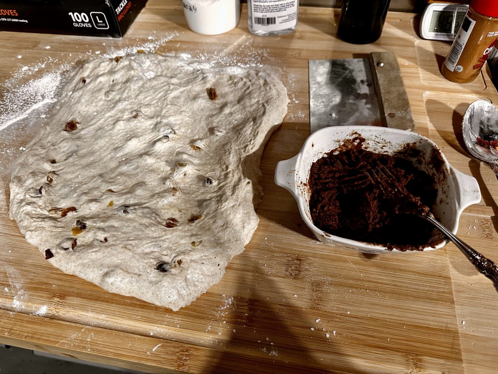 Well, after 5.5 hours, there were many bubbles throughout the dough. But, not many of them rose to the surface or upper edges. The surface was “loose”, but not quite “jiggly”. I decided to wait. After another 45 minutes, I decided we were close to the desired outcome. I moved the dough back to the bench for lamination. I then incorporated the Cinnamon/Butter/Brown Sugar mix. Several online recipes mentioned including flour and salt to this mix, so that’s what I did.