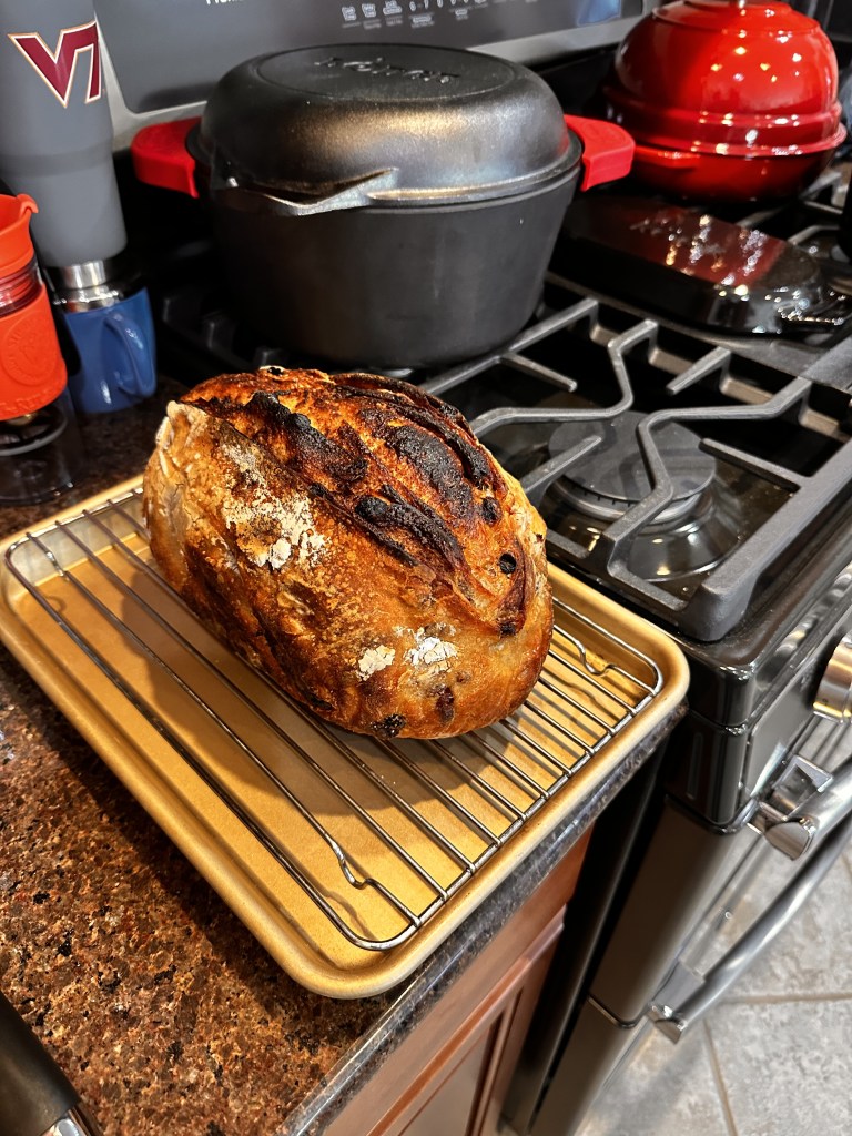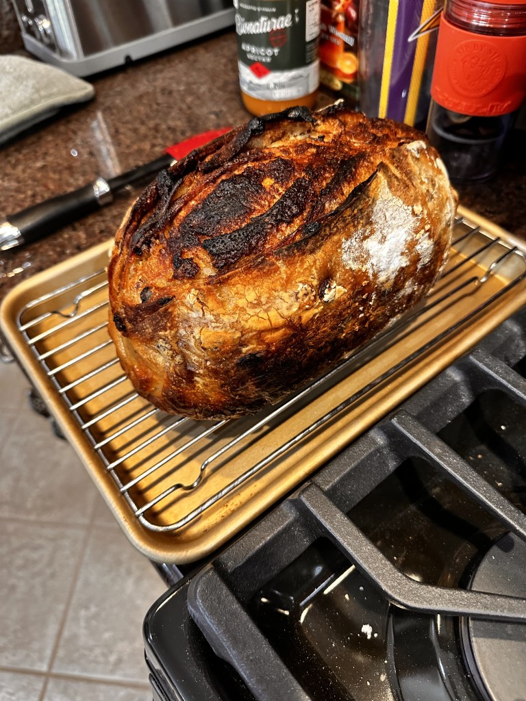 Here’s where I diverged from my normal process. Normally I cold-bake everything from a cold oven and cold Dutch Oven. In this case I decided to try pre-heating at 500 degrees and then turning the oven to 450 and starting the bake once the loaf was loaded.