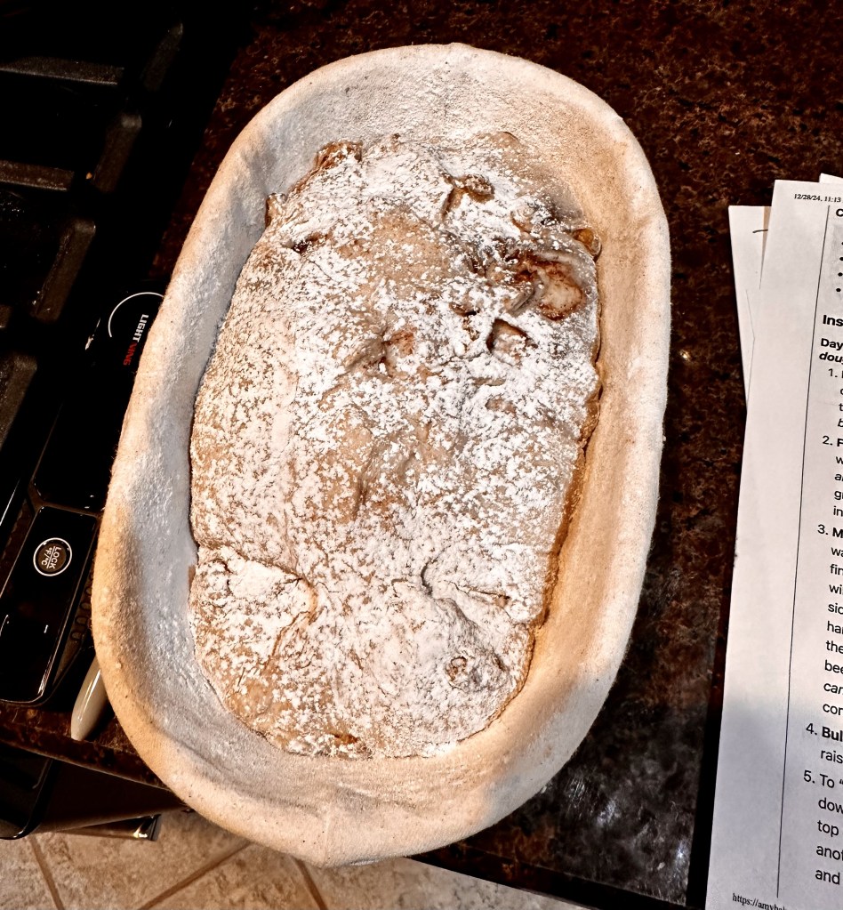 Raisins: I added 120g of Golden Raisins during the third stretch & fold. I didn’t account for the addition of dried fruit in the first water addition. So, I soaked the raisins in very hot water for a few minutes before adding them to the bowl. From what I read, dried Raisins from the box can draw water from the dough. You can either add water in the beginning, or soak the Raisins as I did in warm water.