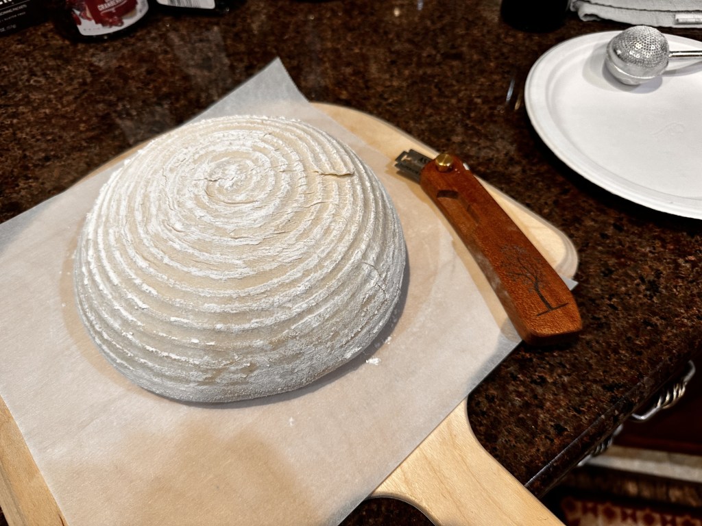 Eight hours later Bulk Fermentation was finished. I checked for all the signs of BF completion outlined on the Sourdough Journey website. These include smell, structure (jiggly), bubbles along the sides, and rise. I followed with pre-shaping, a half-hour rest uncovered, and then final shaping into the Banneton. Lately I’ve been using the Banneton without the liner. I really like the concentric flour lines as a result.
