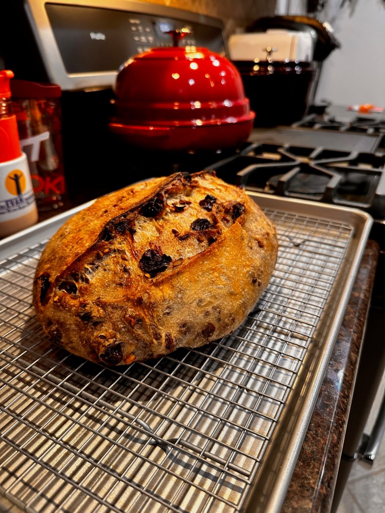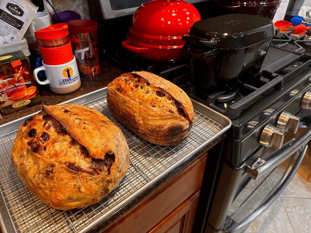 Picture of the final results above. I cooked the larger width loaf in my Staub Oval Bread Cocotte. I used the adjacent black KooK Dutch Oven for the smaller diameter loaf. Both came out very, very good. It’s one of the few loafs that my wife has enjoyed as she loves the fruit and nut combo. A good friend of mine gave me a very good compliment. This friend and her husband have taken classes at King Arthur Baking in Vermont. They also studied at the Culinary Institute of America in NYC.